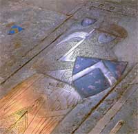 In front of the altar rails lie the famous brasses of the two Sires John D’Abernon, the elder and the younger. Contrary to oft-repeated claims that the brass of Sir John the Elder is the oldest in England, the brasses actually date from about 1325 and 1350 respectively. The great brass of Sir John the Elder is, nevertheless, unique in showing a knight holding a lance as well as a sword, very rare indeed in possessing original enamel in the shield, and of workmanship such that, if not the oldest brass in England, it can rightly claim to be the finest military brass in existence.