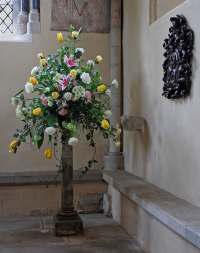 The furniture in the sanctuary dates from the 17th century. The altar-table is Laudian, about 1620, and has a moveable top. The altar rails and remarkable English baroque aumbry (a cupboard or safe in which the Holy Sacrament is kept) are of a similar period. The aumbry, of oak carved with cherubs, a stylised pelican, phoenixes and acanthus, appears to be unique in an English church and may have been made originally for the oratory of a recusant country house or for an ambassadorial chapel.  The onyx flower pillar dates from the late 18th century and is thought to have come originally from the Royal Pavilion at Brighton.