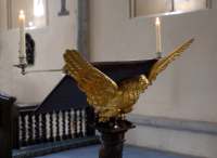 The handsome and unusual lectern dates, like the pulpit, from the 17th century and its gilded eagle is English. The salmonic column, typical of the baroque style, is uncommon in England (although Wren made use of it) but this, with its Italianate flavour, could be the work of a continental craftsman living in this country. It is made of oak, whereas limewood would more commonly have been used for such work outside England.