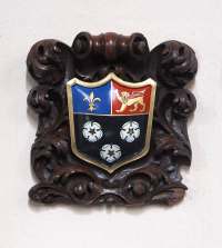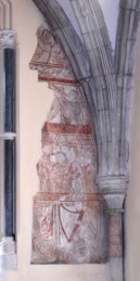 During the reign of Henry II, at around 1240, the rounded Saxon apse was replaced by the present square-ended chancel, with fine quadripartite stone vaulting. It has star ornament and roll moulding on the ribs, a gilded boss carved as a rose (the emblem of the Virgin Mary) and delicately proportioned shafts rising from the surrounding stone seat on moulded bases. The axis of the chancel, probably aligned on the contemporary sunrise, inclines 4 degrees to the north of that of the nave. The east wall was decorated with a 13th century mural painting of the Adoration of the Lamb, of which there is a surviving section to the right of the East window. In the early 14th century a large east window was opened up. An old walnut cartouche over the Rector’s stall bears the arms of King’s College Cambridge, patron of the parish.
