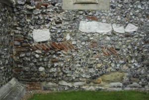 Neolithic artefacts hereabout suggest that Stoke D’Abernon may well have been inhabited from prehistoric times and thus proved convenient for the Romans to take over. Numbers of bricks, tiles and worked stones of Roman origin were used in building the Saxon church and are easily distinguishable externally in the south nave and chancel walls, among the large field flints of which the walls are otherwise constructed. A drawing of 1828 by Twopenny (which can be seen in the north transept) shows the original Saxon chancel arch,  undoubtedly constructed with re-used slabs of Roman cornice. The Saxon chancel arch was an unfortunate casualty of Victorian rebuilding work carried out in 1854 and, subsequently, 1866 when the present, much wider arch was constructed.