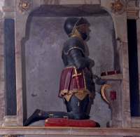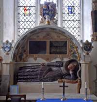There is a monument to Sir Thomas and Lady Jane Vincent (1613 and 1619) against the north wall and another on the east to their daughter-in-law Dame Sara Vincent, who died in 1608. Her children, in an attitude of prayer, are carved as weepers on the plinth of the tomb. The tomb of Sir John Norbury, who died in 1521, once stood under the archway forming the eastern bay of the chapel but Sir John is now commemorated in the south-eastern corner of the chapel by the delightful little kneeling figure of a knight in armour of the time of Charles I, with his original tomb-brass below it. Today the site of Sir John’s lost tomb is occupied by the tombstone of the first known Rector, Sire Richard le Petit, who lived in the 13th century. The 15th century funerary helm hanging above it was used at the funeral of Sir Thomas Vincent in 1613. Below this, encased in the east wall in a stone Roman cinerary coffret from the 2nd century AD (the oldest artefact in the church), rest the ashes of Sir Edgar Vincent, Viscount D’Abernon, HM Ambassador to Berlin 1920-26, whose death in 1941 brought the tenure of the D’Abernons at Stoke D’Abernon to a close after nearly 750 years.